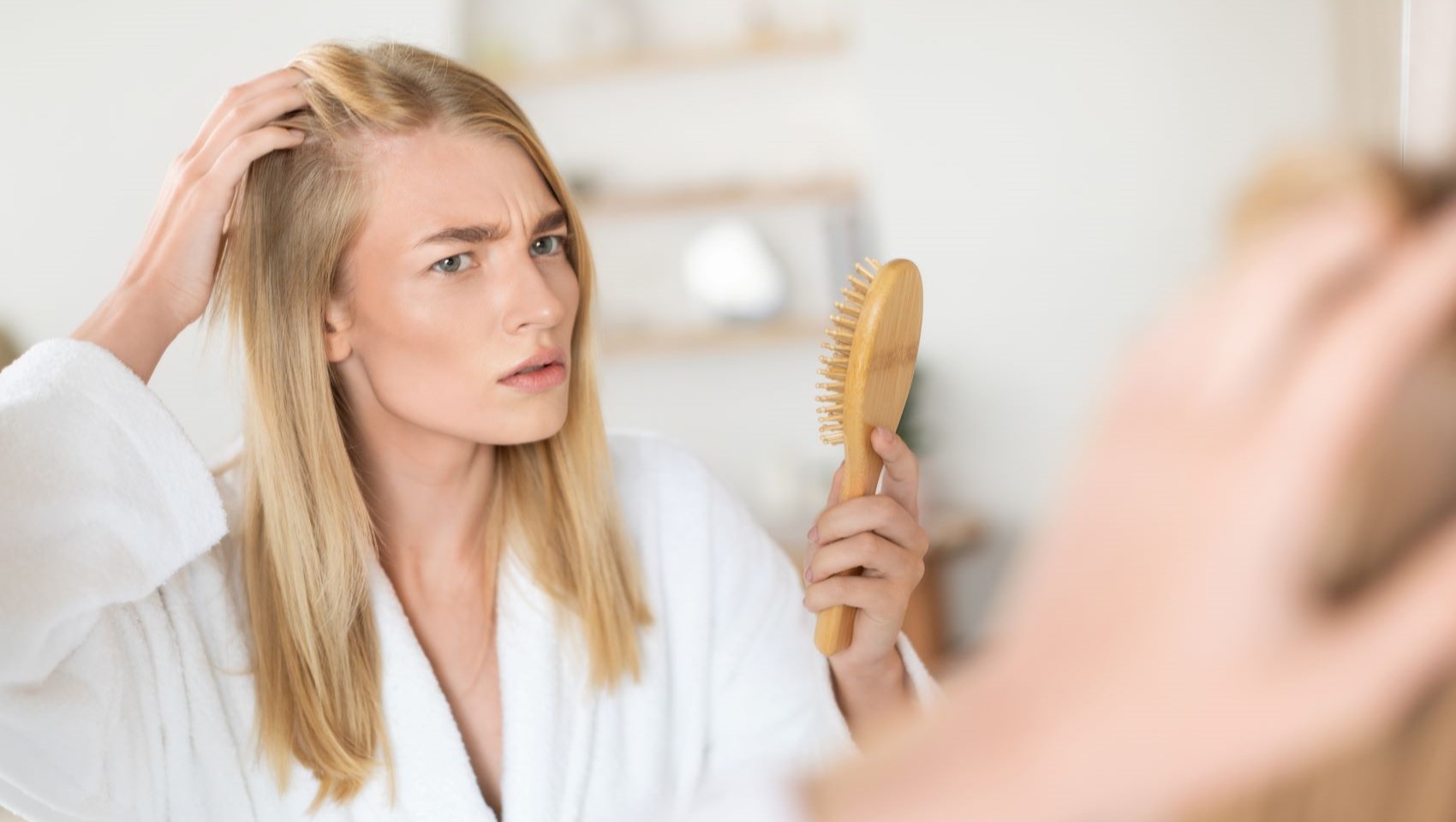 Телогеновая эффлювия проявляется равномерным выпадением по всей голове – без четких очагов, без залысин по мужскому типу. Характерные признаки: волосы остаются на подушке, в душе, на расческе в заметно большем количестве, чем обычно. Пробор визуально расширяется. Кожа головы может начать просвечивать при хорошем освещении.